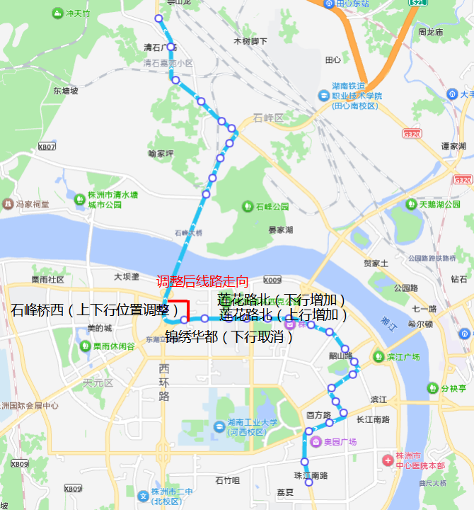 下行:珠江花园-熹悦花都-泰山路圆方路口-九龙医院-黄河路泰山路口-黄河路天伦路口-天台路黄河路口-市政府-长江广场北口-市人社局(爱尔眼科医院)-长江路嵩山路口-长江路明珠路口-株洲大道庐山路口-尚格名城-株洲大道神农大道路口-市体育中心-株洲大道湘山路口-莲花路北-石峰桥西-石峰桥东-响田西路中-响田西路东-响石广场西口-响石广场北口-外国语石峰学校-建设路天桥路口-建设路清水路口-清石广场-清石基地