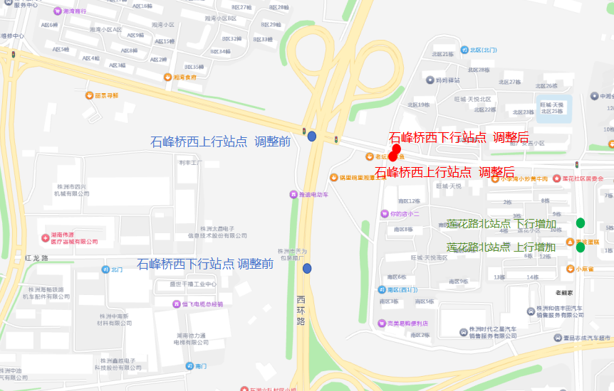原线路行经石峰桥西路段的部分将进行调整,如下图所示: